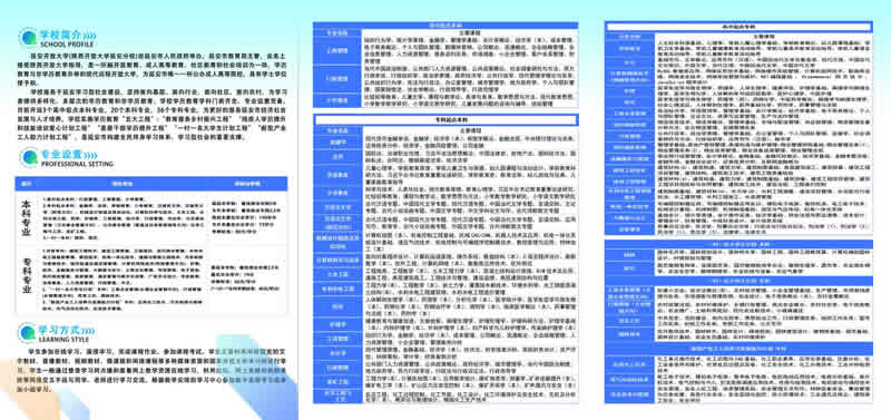 學校設置高起專、高起本、專升本、研究生(MBA)等多種學歷層次,開設管理、經(jīng)濟、教育、理工、建筑、石油、化工、醫(yī)藥、農林等類60多個專業(yè)。